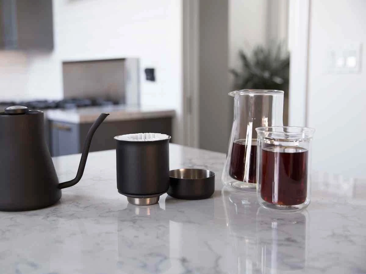 Included drip cup for convenient and mess-free removal of dripper when your brew is finished; doubles as dosing tool with ratio aid indicators for measuring out correct amount of coffee for 1 or 2 cups.